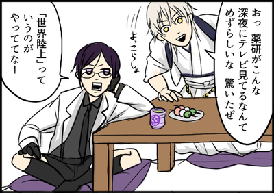 深夜に『世界陸上』を見ている鶴丸と薬研