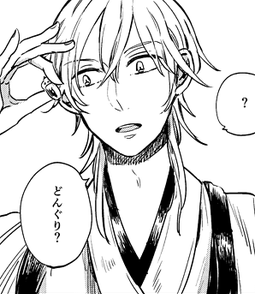 庭先で見つけたどんぐりを不思議そうに見つめる鶴丸さん
