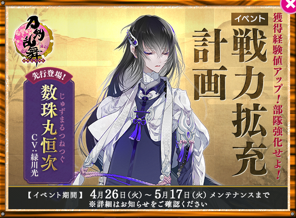 本イベントでは、刀剣男士「数珠丸恒次(じゅずまるつねつぐ)」が登場します!一部の刀剣男士の入手率もアップ中です。詳しくはお知らせをご確認下さい #刀剣乱舞 #とうらぶ