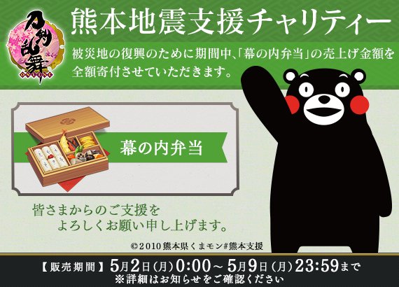 刀剣乱舞-ONLINE-では熊本地震への復興支援を実施いたします。2016年5月2日0:00~9日23:59の間に販売された「幕の内弁当」の全ての売上げを被災地へ寄付させていただきます。