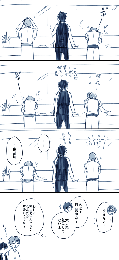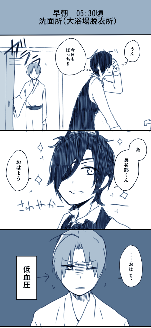 審神者の雨水@t_rainwater113 描いた うち本丸の燭台切さんと長谷部と歌仙さんの朝 時間はわりと適当 https://t.co/WRMOMQbt9N 2015/10/20 07:05:40
