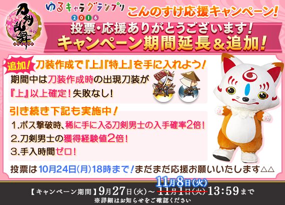 詳しくは、イベント・キャンペーンの「こんのすけ ゆるキャラグランプリ 応援キャンペーン!」をご確認ください。