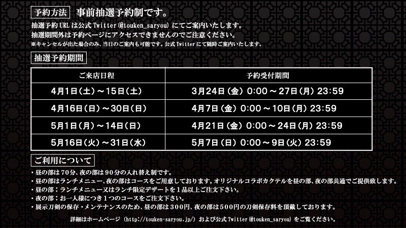 【お知らせ①】4/1(土)~5/31(水)の期間、TVアニメ『活撃 刀剣乱舞』とのコラボが決定しました!期間中ご来店のお客様に特製ランチョンマットをプレゼントします。事前抽選予約制となりますので、詳細をご確認頂きご来店ください。… https://t.co/2QXbeZ4qXC