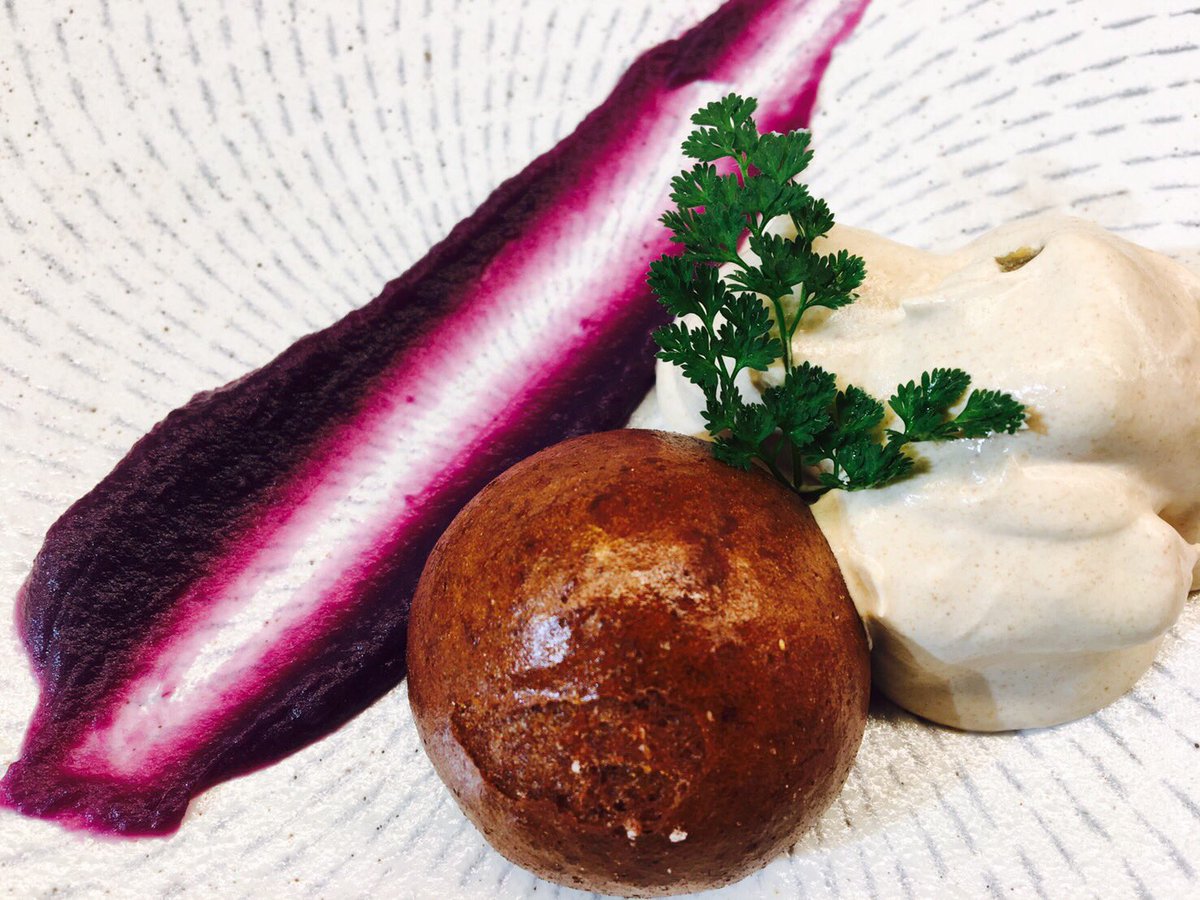蜻蛉切のかりんとう饅頭とクリームわらび餅 紫芋のピュレ添え