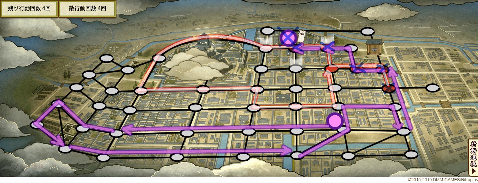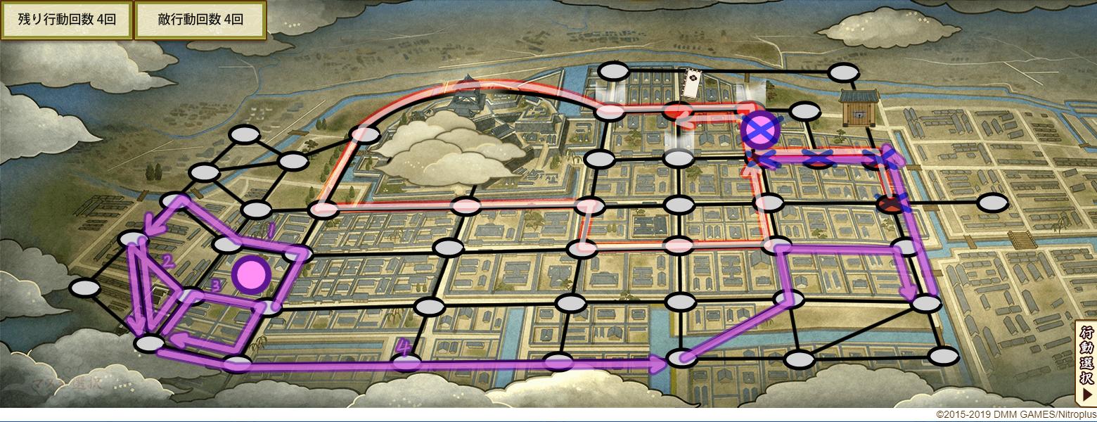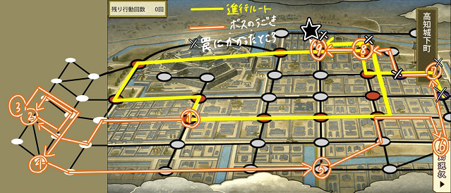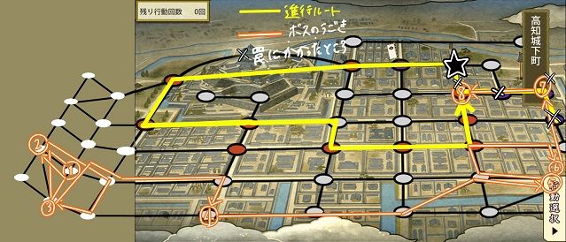 刀剣乱舞-ONLINE-(とうらぶ)のイベント「文久土佐藩」にて、高知城下町の移動ボスを追跡する際に最短で15手という少ない行動回数で追いく事が実現可能なルート案がある模様。