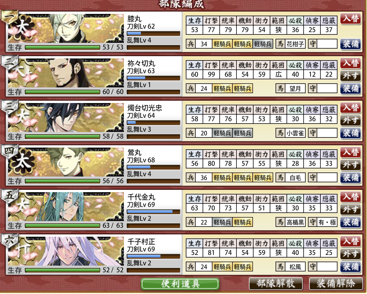 - 装備は軽騎兵や軽歩兵等の機動上がる刀装で固め、馬の装備を忘れずに