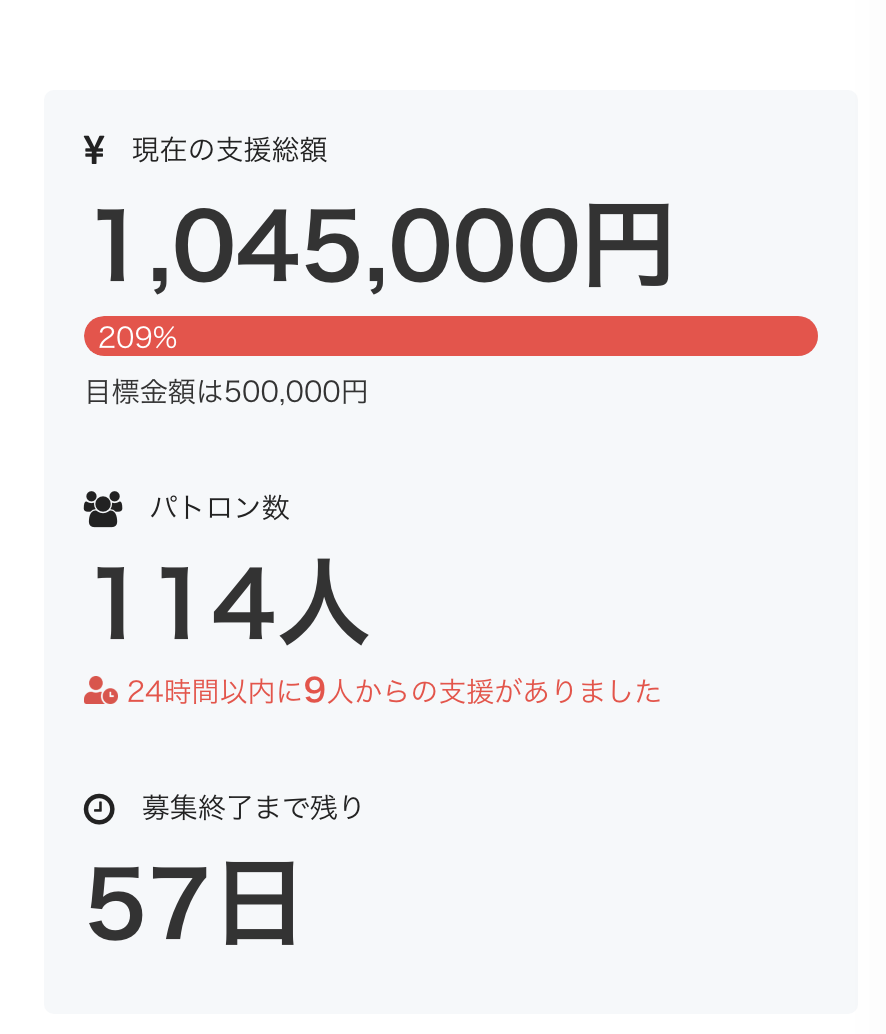 目標金額は50万円でしたが1日で達成したみたいです。現在100万円程度集まってます。