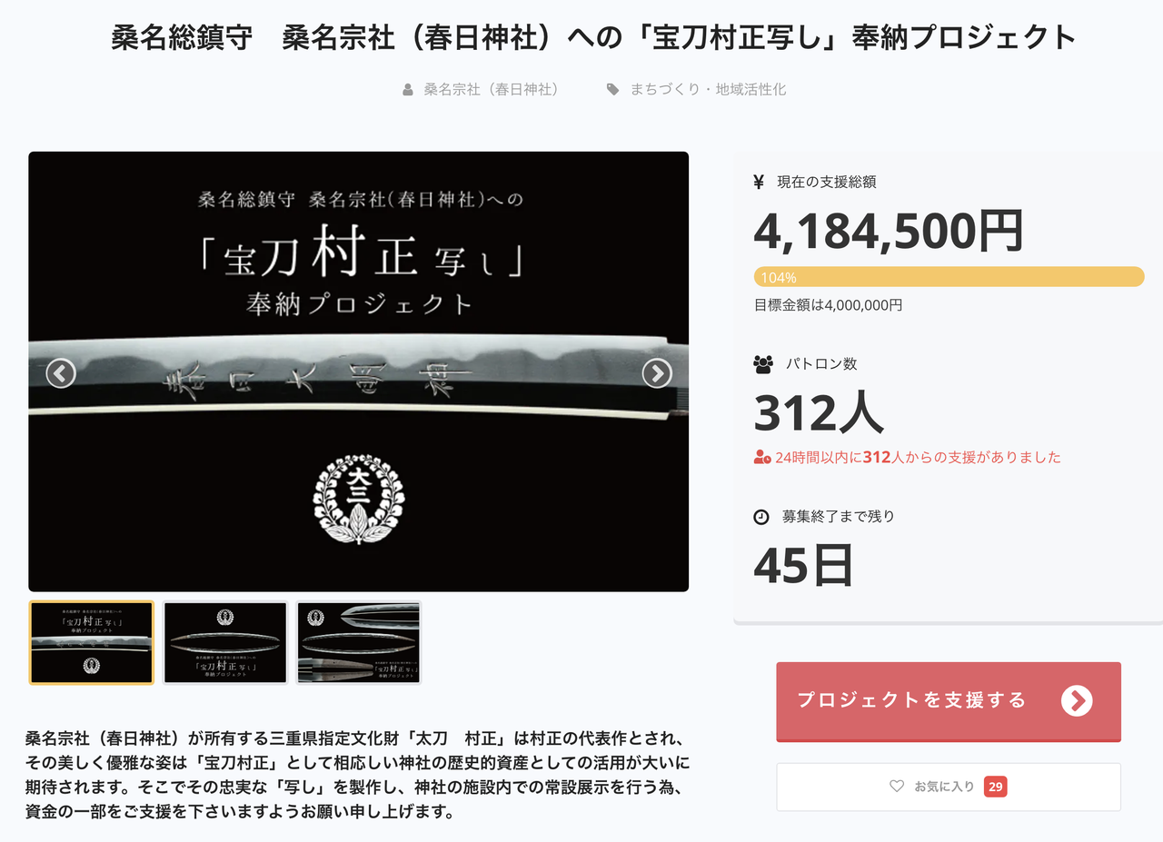 宝刀村正写し奉納プロジェクトのクラウドファンディングが開始されて、4時間という驚異的なスピードで目標金額の400万円を達成致しました。
