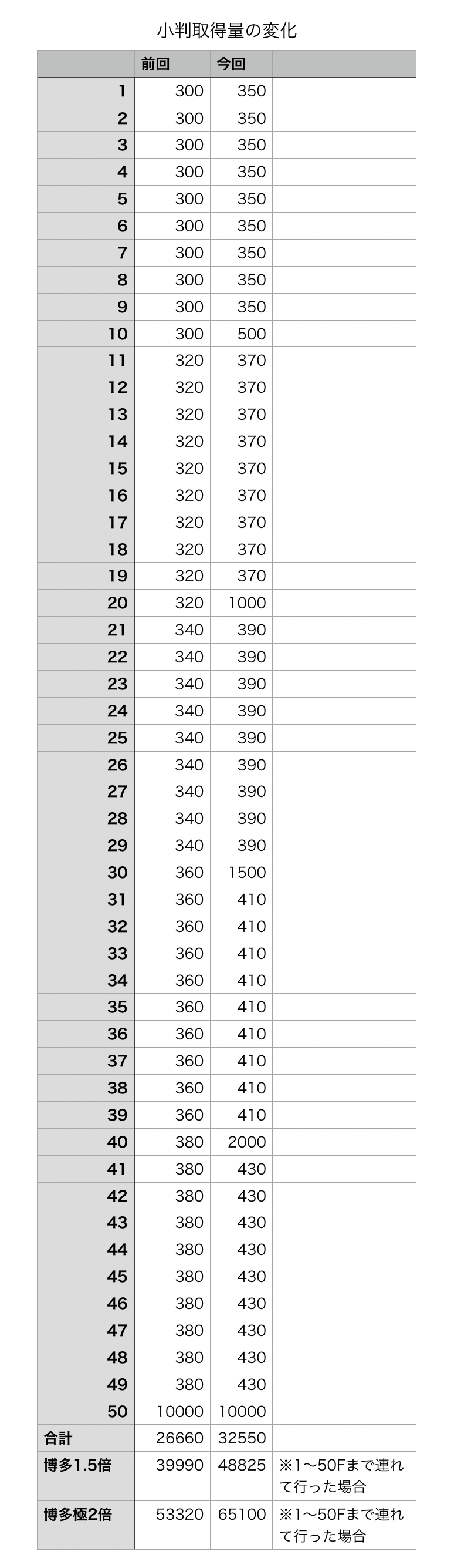 - 1〜49Fまでの小判の量が増える
