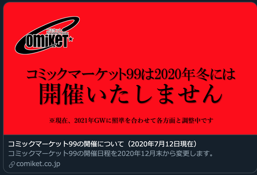 公式Webサイトで『コミックマーケット99の開催について(2020年7月12日現在)』を公開しました。2020年冬コミックマーケット99の開催は行なわず、2021年GWの開催を目指し、現在関係各方面と調整中です(続く)。 #C99 bit.ly/3fmfp9b