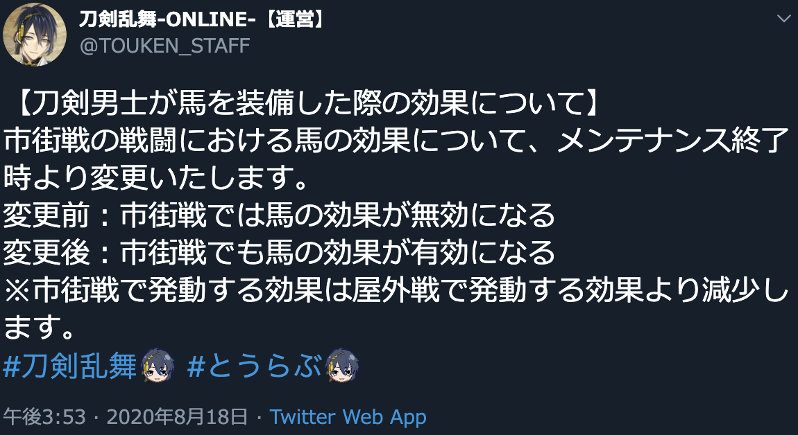 — 刀剣乱舞-ONLINE-【運営】 (@TOUKEN_STAFF) August 18, 2020