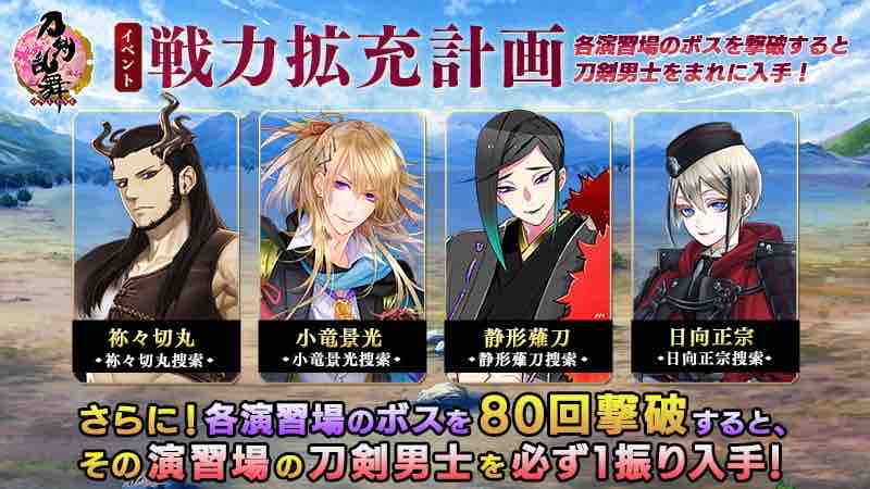 刀剣乱舞-ONLINE-【運営】@TOUKEN_STAFF (1/3) 【イベント「戦力拡充計画」開催!】 メンテナンス終了時より、イベント「戦力拡充計画」を開催いたします!難易度や特徴の異なる4つの演習で構成された本イベントで、部隊を強化しよう! <開催期間>9月8日(火)メンテナンス終… https://t.co/wGcyvkbncs 2020/09/08 17:03:25