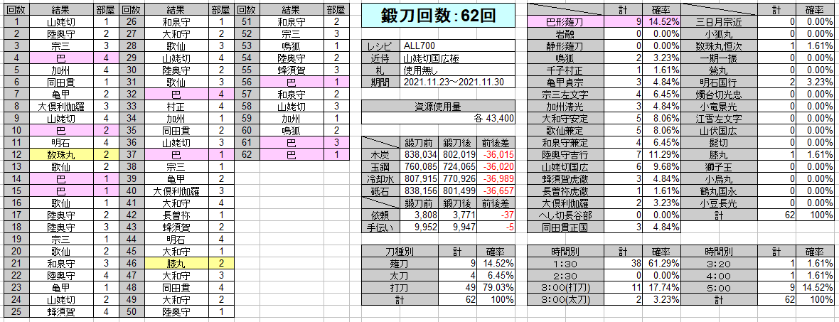 (バグ部は個体名なのでOK。バグ部の場合は鍛刀時間もご報告ください)